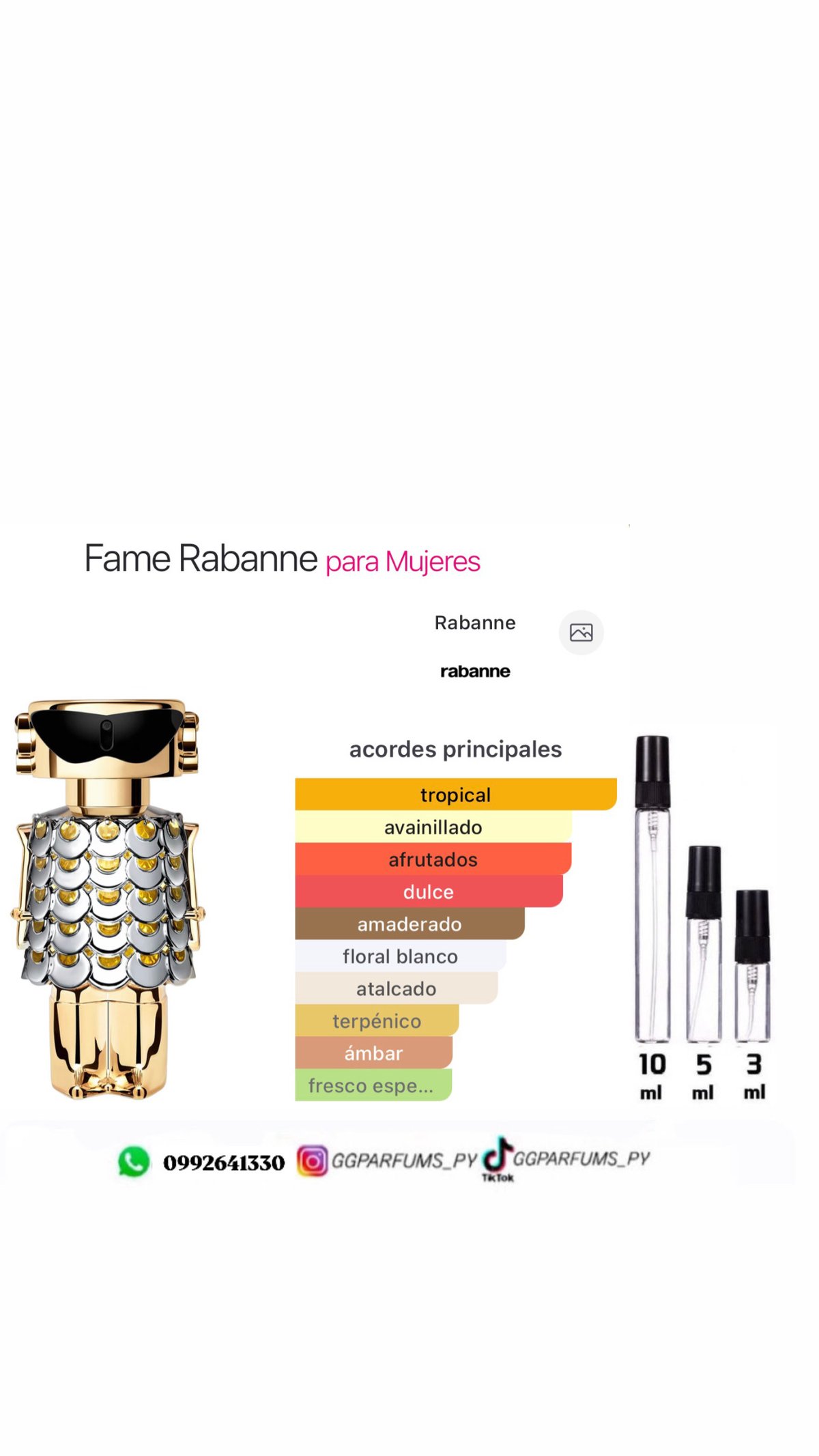 Paco Rabanne Fame EDP es una fragancia femenina moderna, dulce y sofisticada. Combina mango jugoso, jazmín luminoso y un fondo cremoso de incienso y vainilla, logrando un aroma elegante, sensual y muy llamativo. Ideal para el día o la noche. Femenina, única y con mucha personalidad.